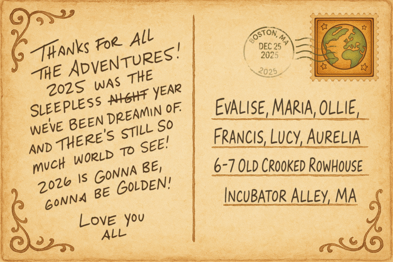 Next Kenton and I secretly assembled the puzzle and then broke it apart in 40-50 piece chunks.Every day the kids would assemble one of the chunks together (~1-2 postcards), and on Christmas Eve they had one big illustrated poster puzzle recapping all our wild 2025 adventures.