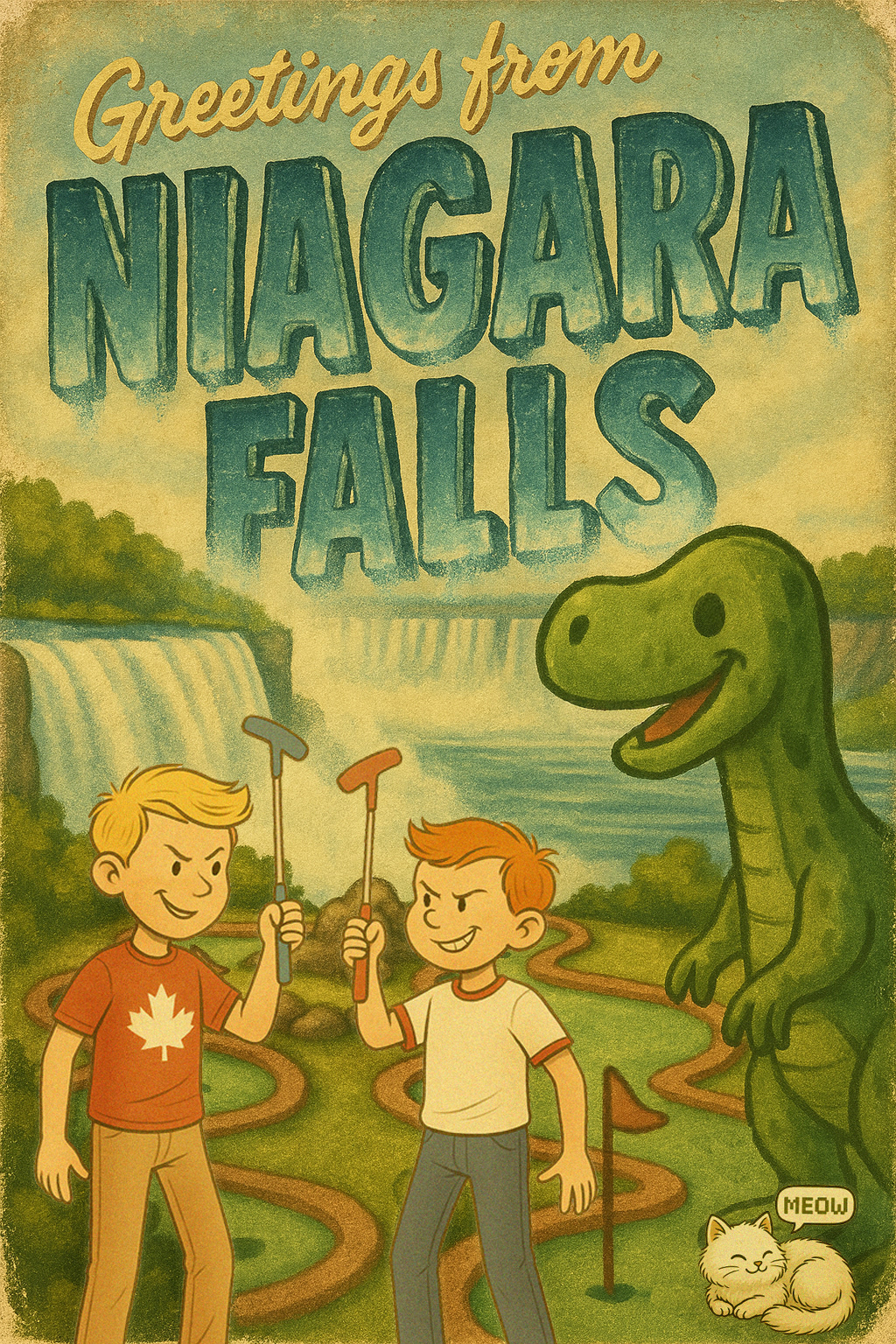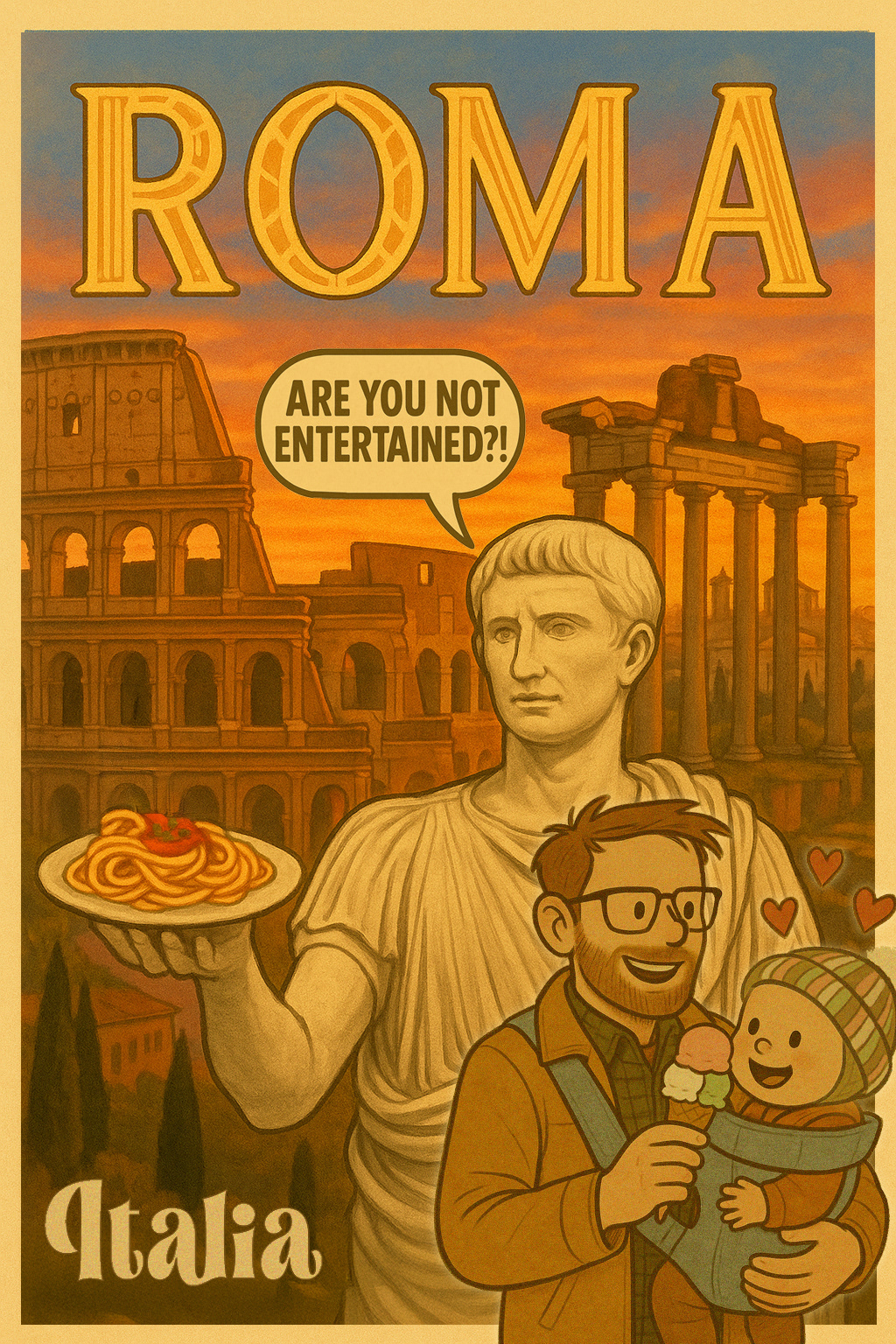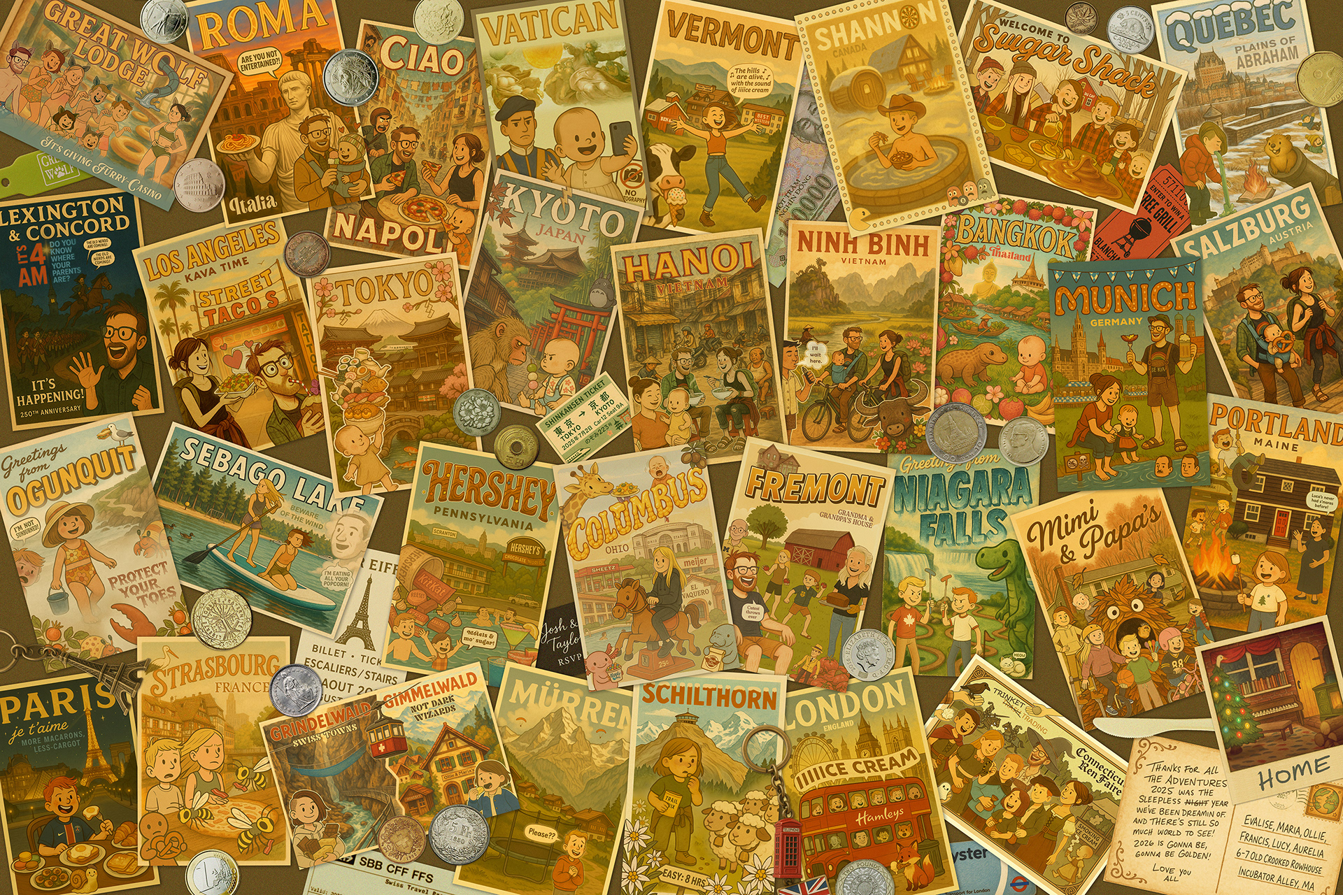 So I spent all my free time in November making 33 retro postcards full of inside jokes of us at all the places we went that year. I made each postcard using a combination of traditional drawing, digital drawing, Photoshop, and AI. Then I combined all the postcards in PS, adding a few coins and souvenirs the kids would recognize, and had it printed onto a 20x30" 1000 piece puzzle.