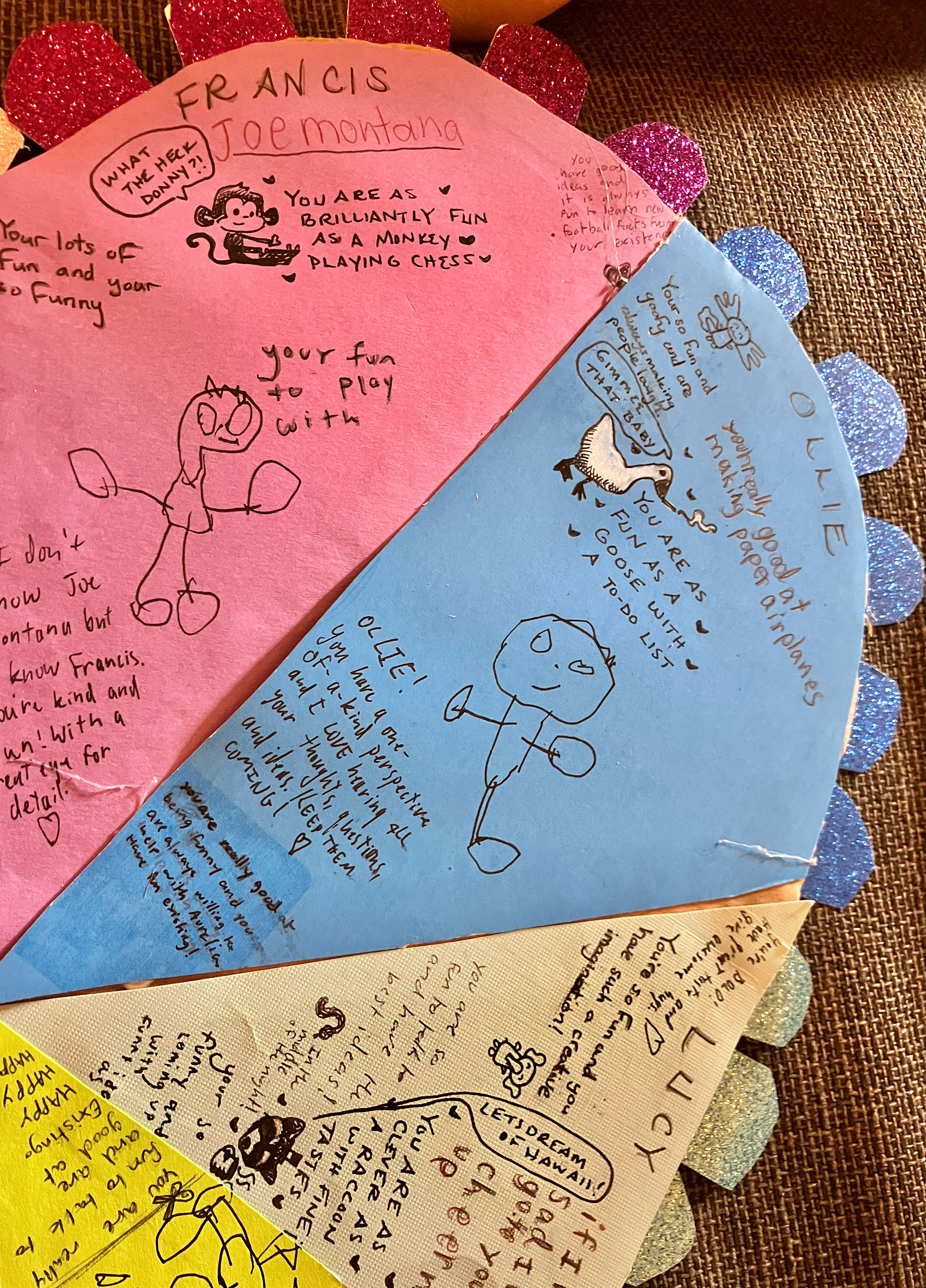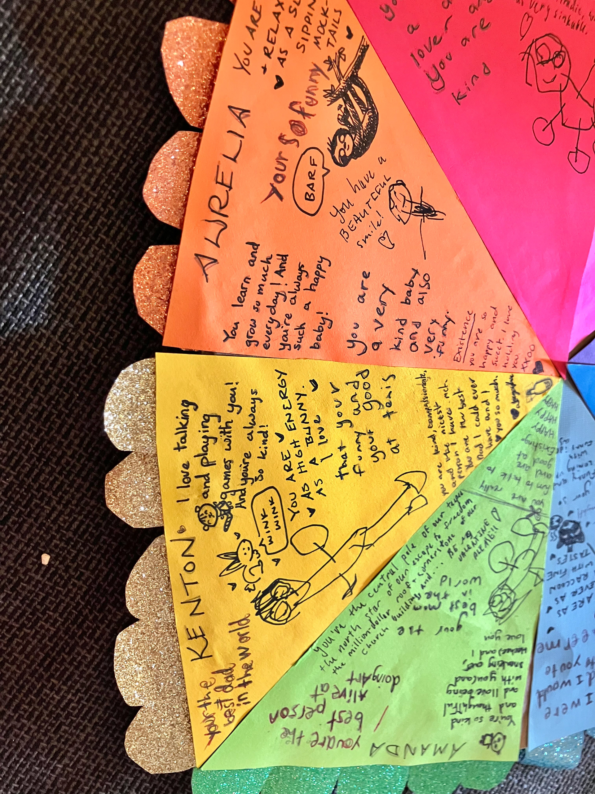 We decided the best way to celebrate Valentine's Day was to make something nice for each other. So we made a giant heart, divided it into 8 sections (one for each person in our family). Then everyone had to write something nice or draw a picture in every one else's section.