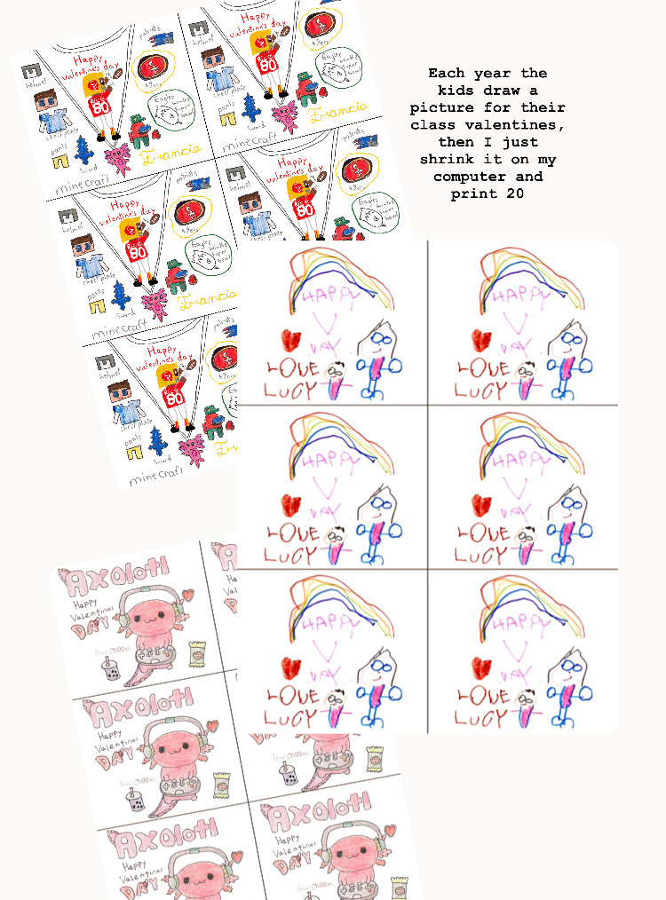 Also, if you're sick of buying junky knick knacks for Valentine's for your kids to handout in school, here's a slightly more thoughtful alternative that we do: