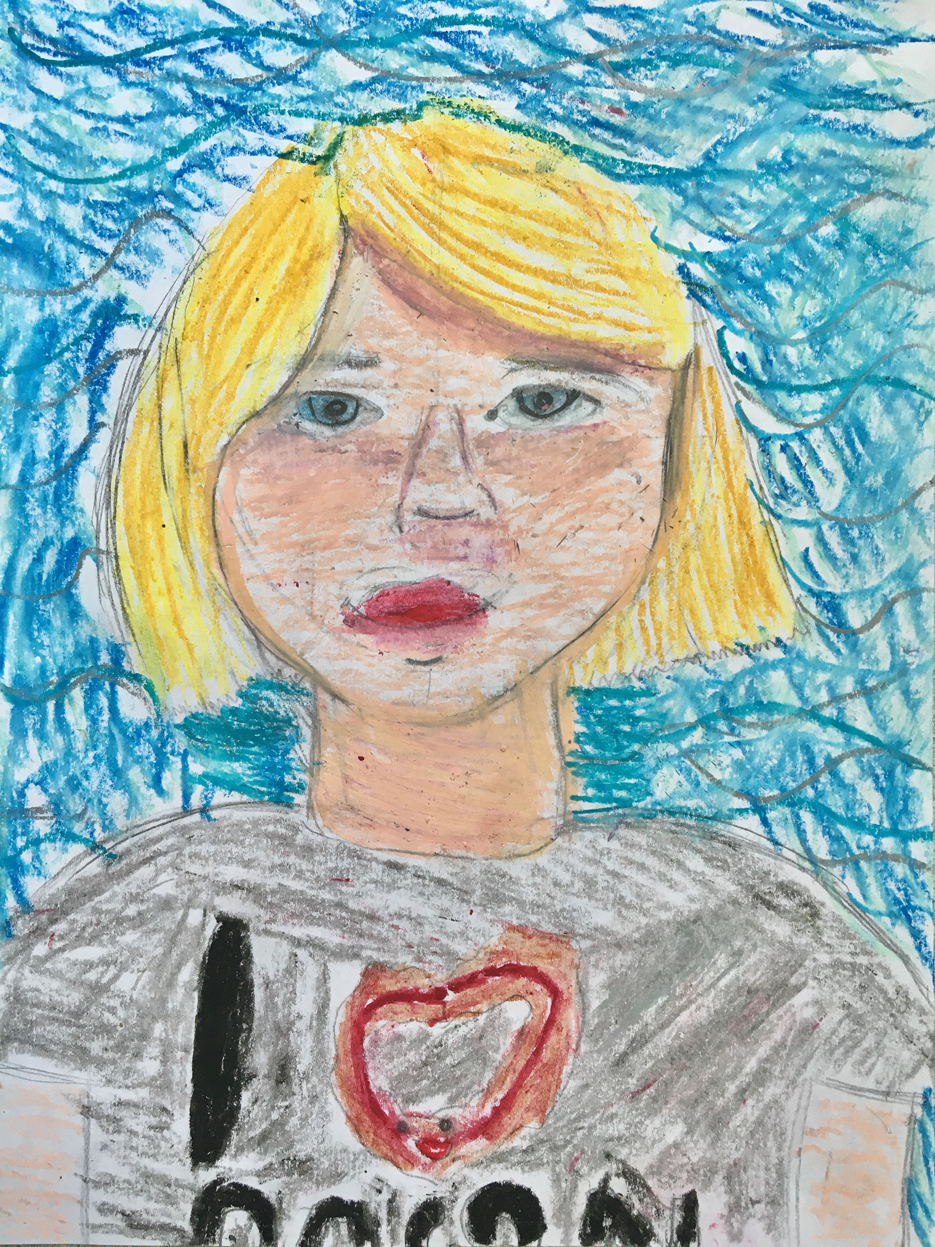 In art class this month, we created a series of self portraits in different styles and mediums. Beginning with pastel.