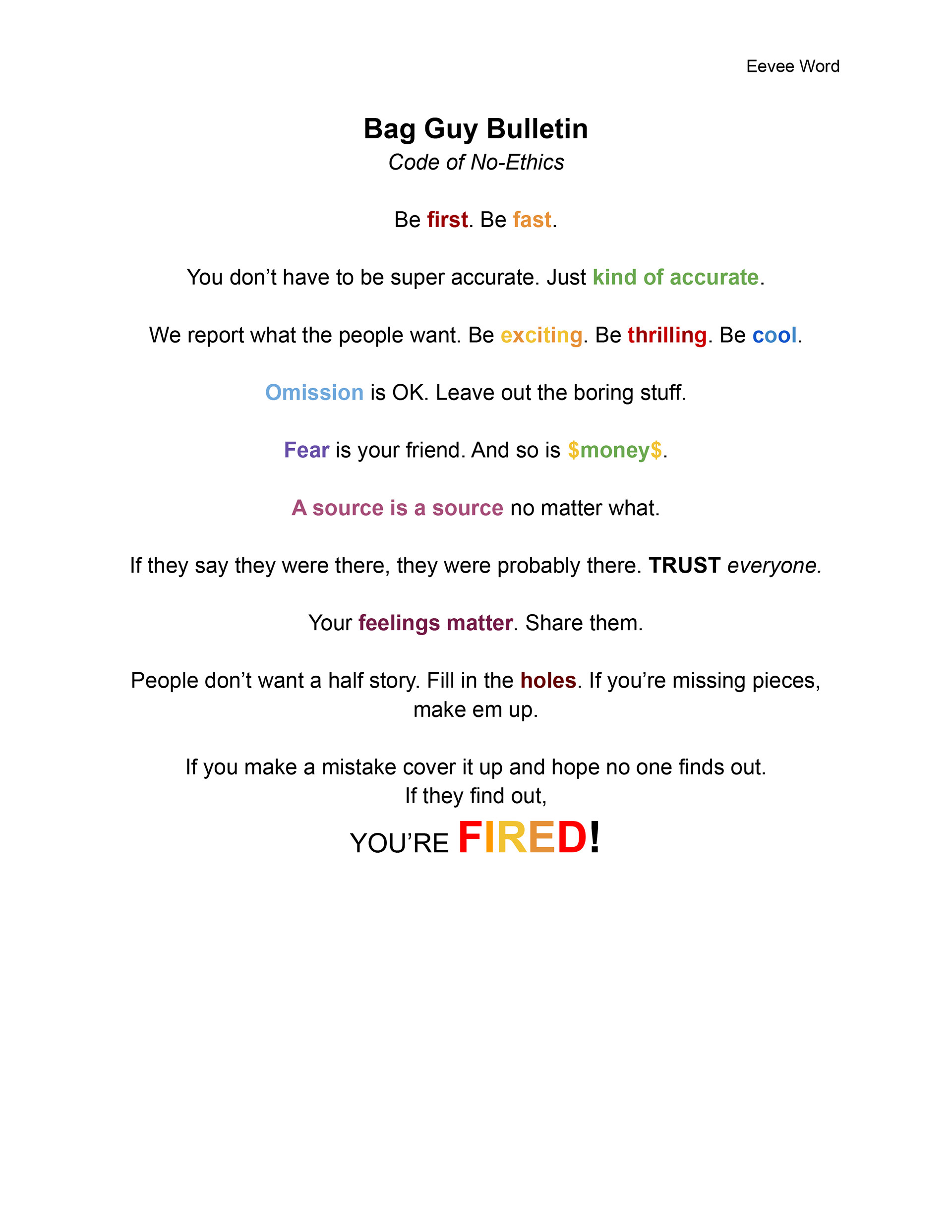 Next they pretended they worked for a sensationalist tabloid and wrote a "code of no-ethics" for their reporters to abide by, keeping in mind their only goal was to increase profit, not accountability.