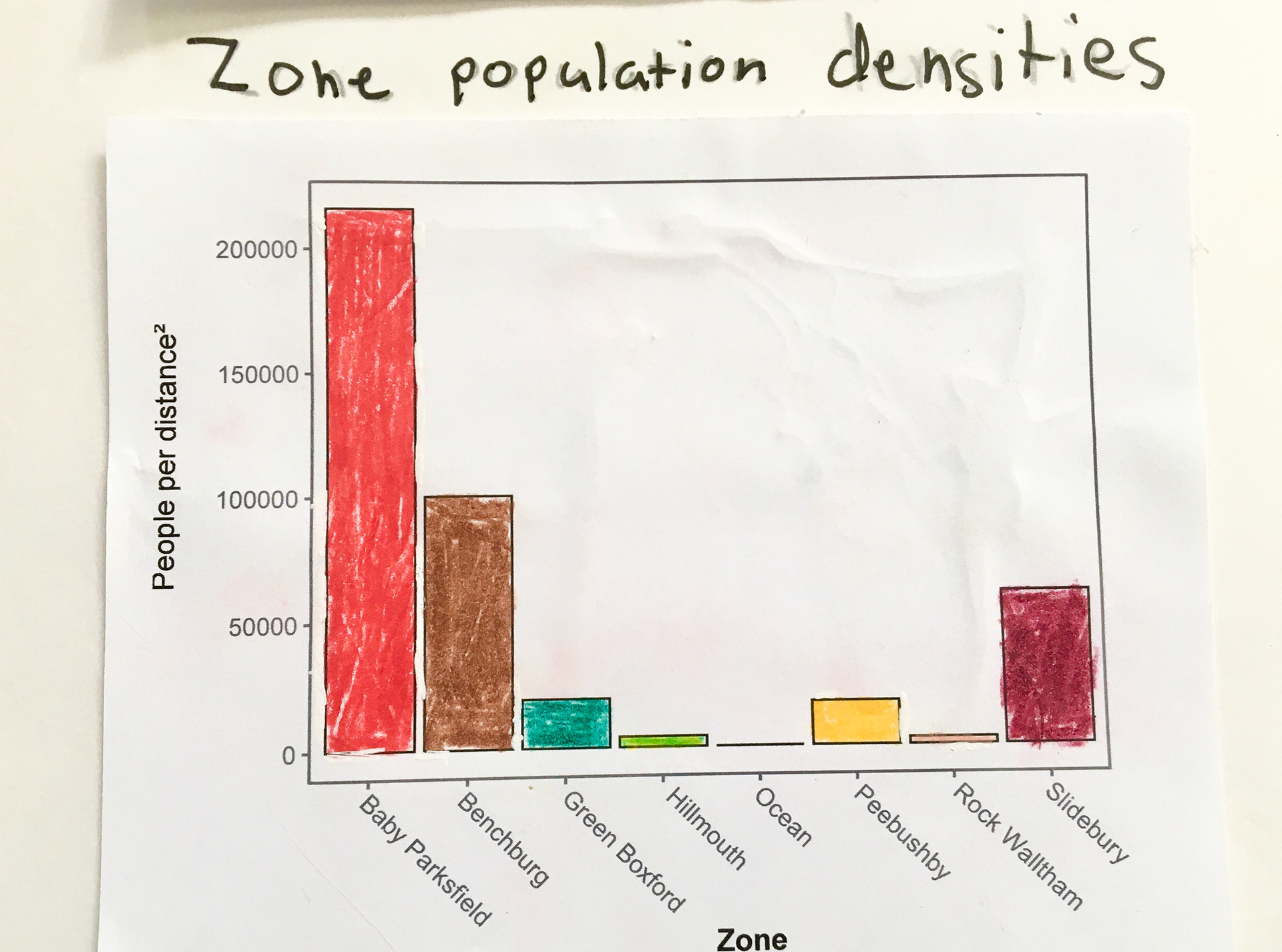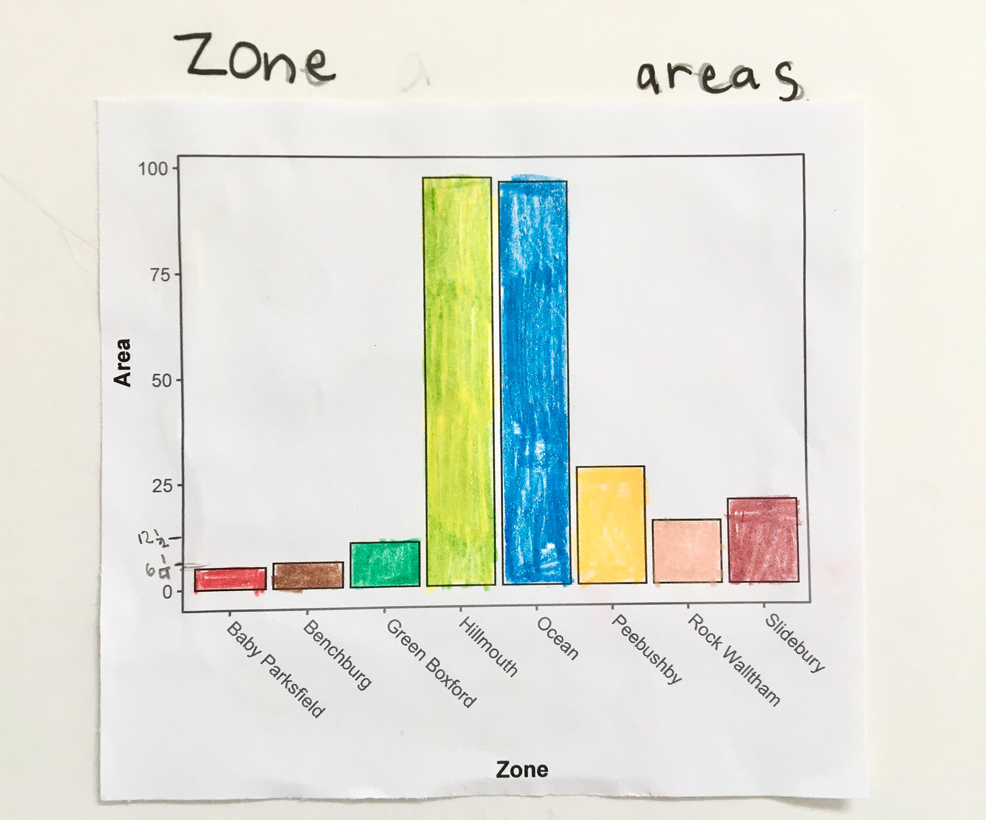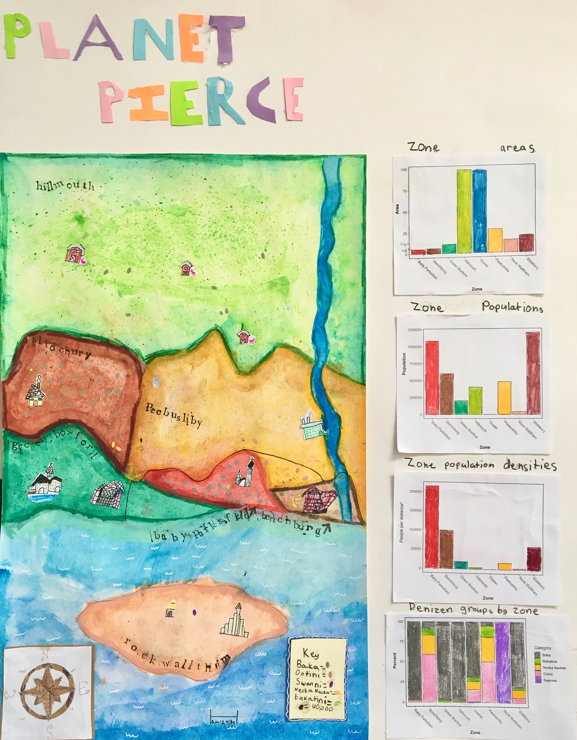 The next part of our project combined math, social studies, science and art. The girls designed a map of Planet Pierce based on the information provided to them. They sketched out a rough draft then had to scale their drafts up for the poster. They calculated the areas of each zone, as well as the populations and population densities. Kenton taught them how to use R to make graphs. They created a key with circles to represent the types of denizens and distributed them based on their graphs.