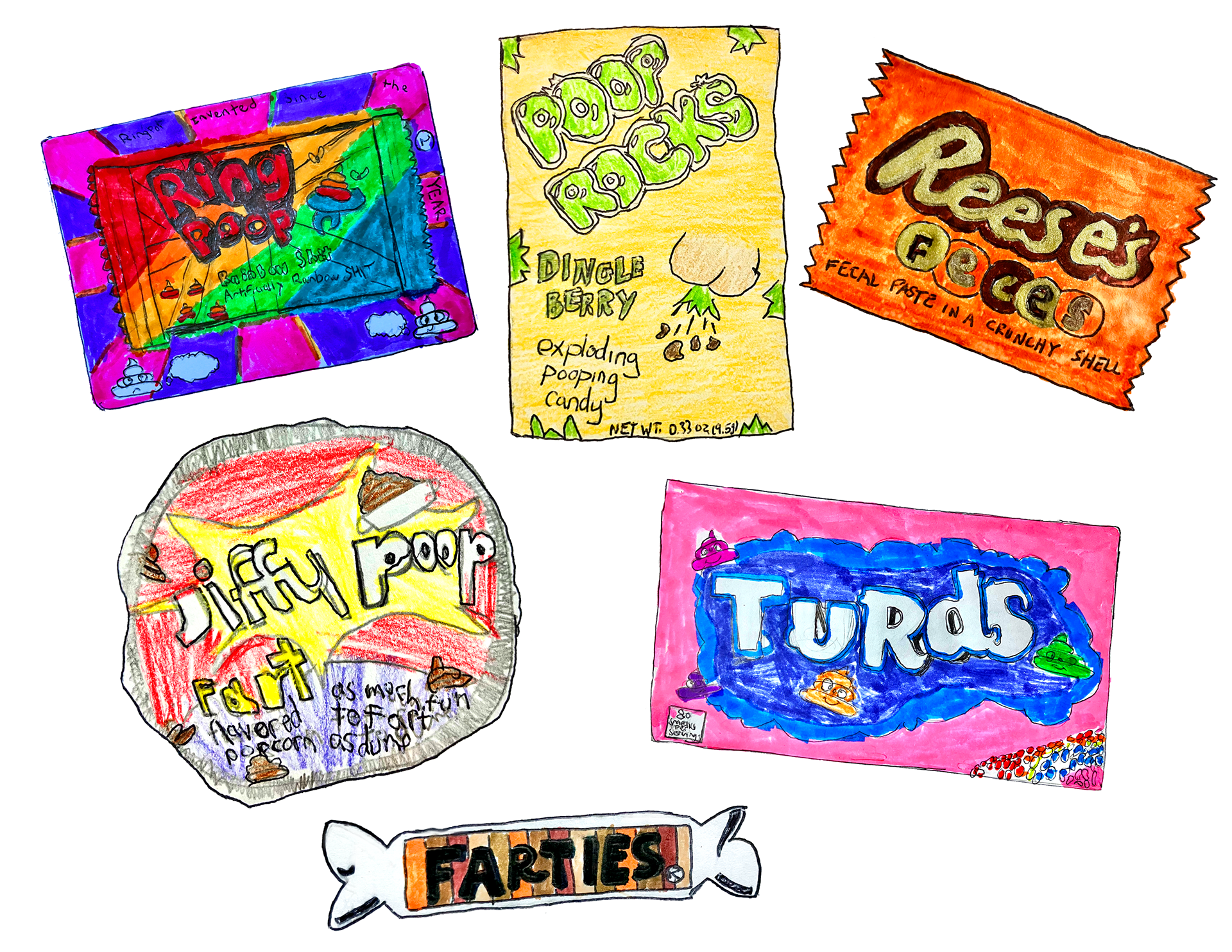 This year, they encountered a gumball machine that dispensed beloved brand names turned into poop puns. It left them inspired, to say the least. So they immediately went back to the campground and drew up some really brilliant designs of their own.