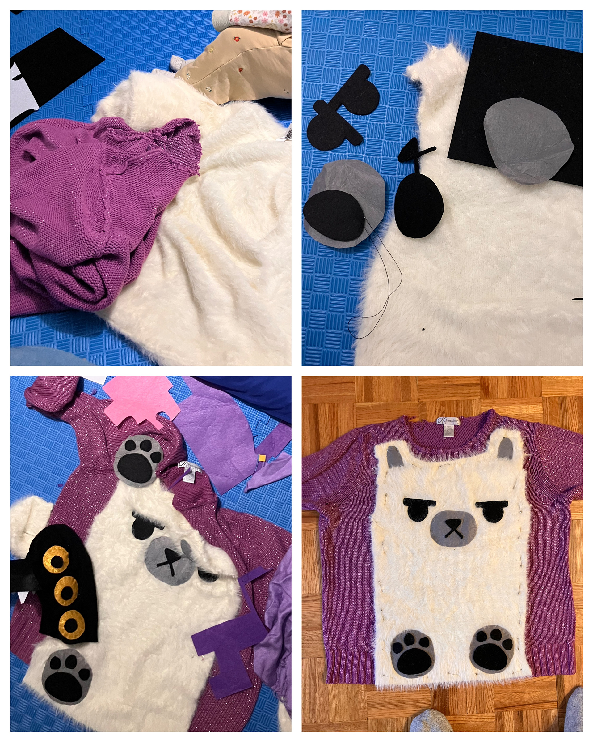 Lucy requested Mira's polar bear jammies for her Halloween costume. So we hit up the thrift store and dissected some fuzzy sweaters to get it done.