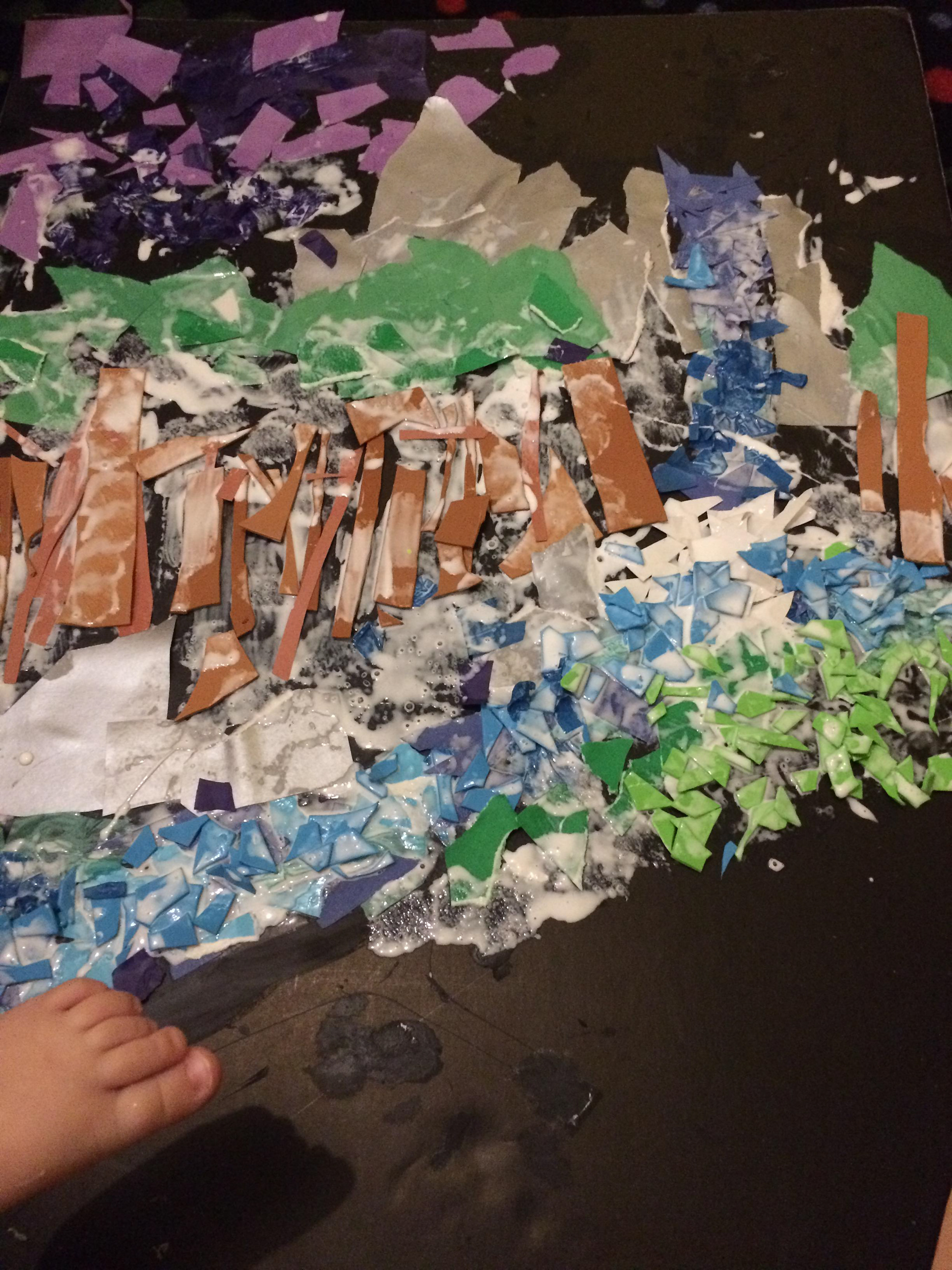 Our scrap paper bin in the afterschool program was overflowing. So we sketched out a landscape, poured glue everywhere, and cut up our scraps to fill it in: