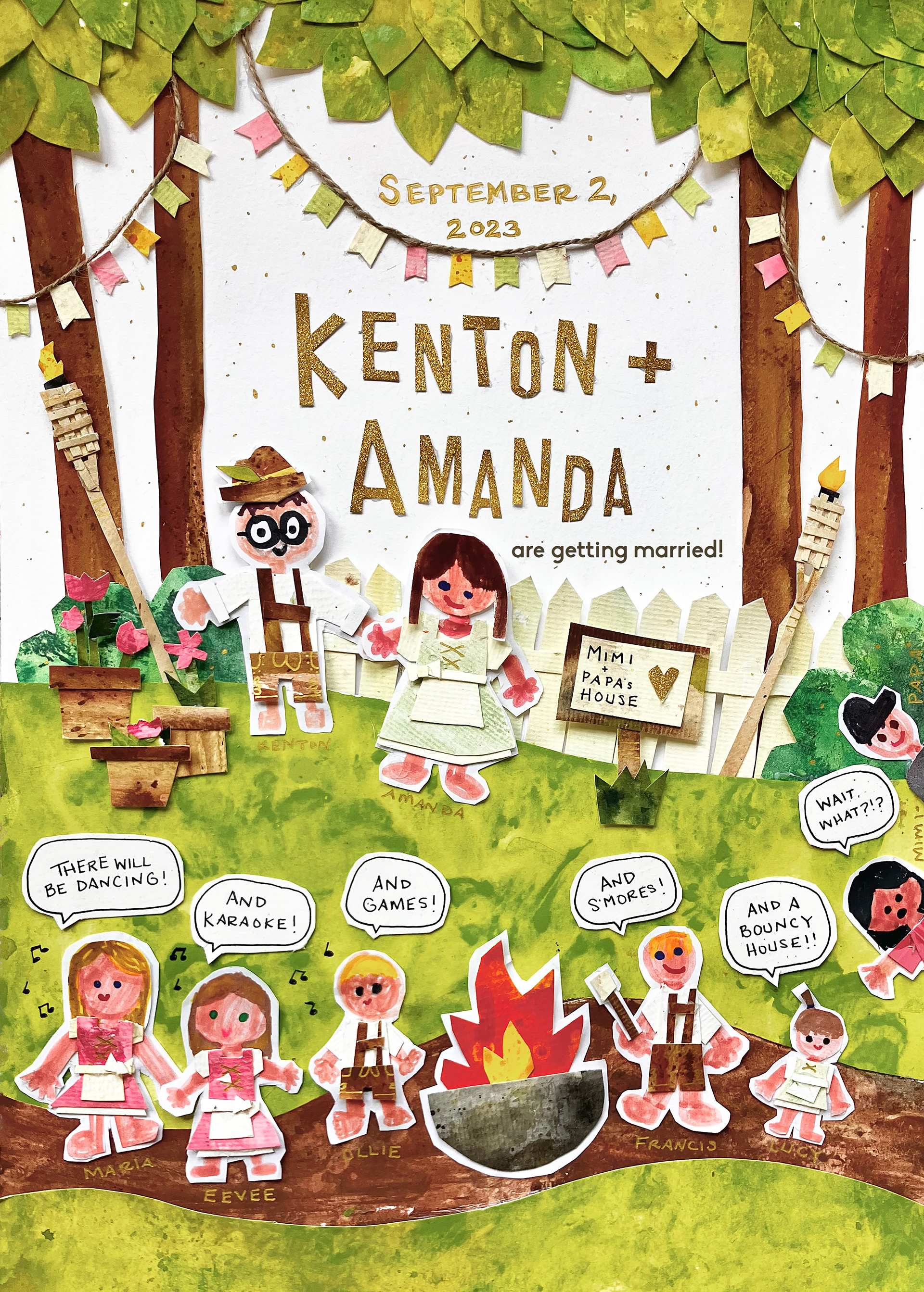 The kids were so excited and got to planning immediately. I sketched out an invitation idea and they painted a bunch of paper and drew our whole family in their wedding attire: