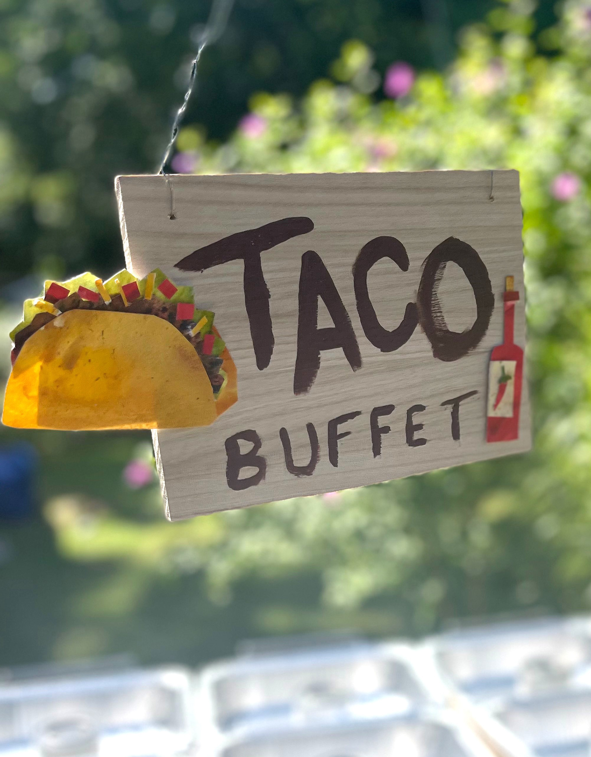 We're pretty much letting the kids run this wedding (hence how we ended up with a s'more station and bounce house). Which means they're also in charge of decorations. So we decided to make some signs for the food buffet together.